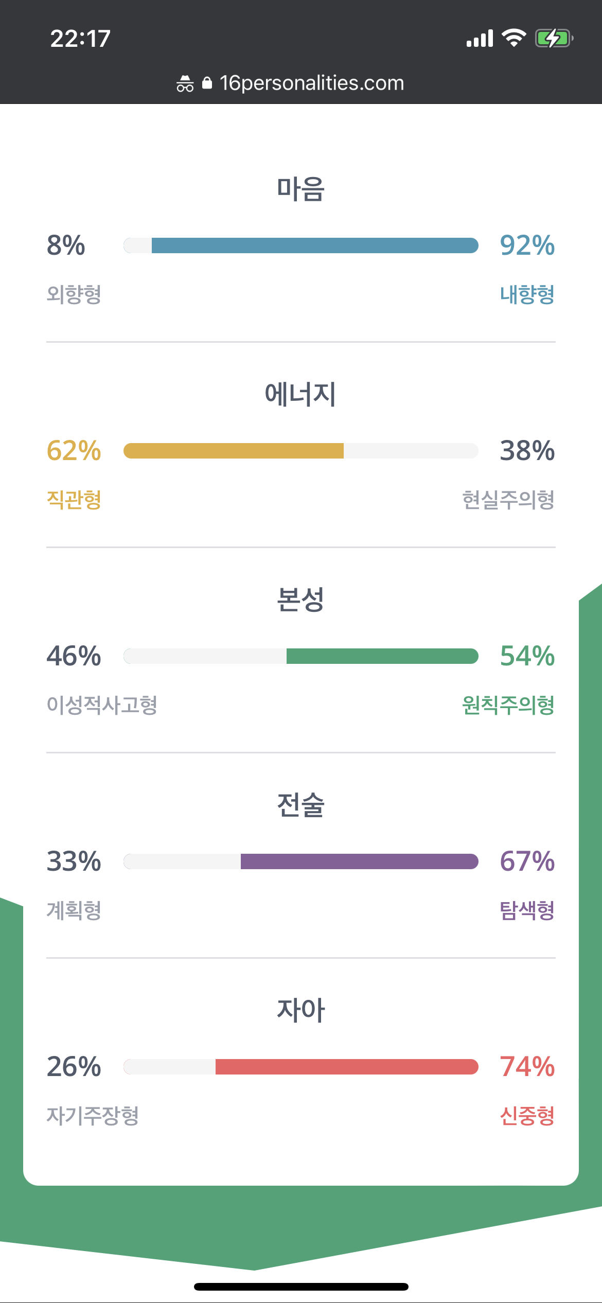 - mbti 재검 : 무료 온라인 사이트이긴 하지만 재검 결과 나의 mbti가 INTP 에서 INFP로 바뀌었다. INTP의 특성도 어느정도는 맞긴 하지만 INFP의 특성과 조금 더 가깝다는 생각이 든다.